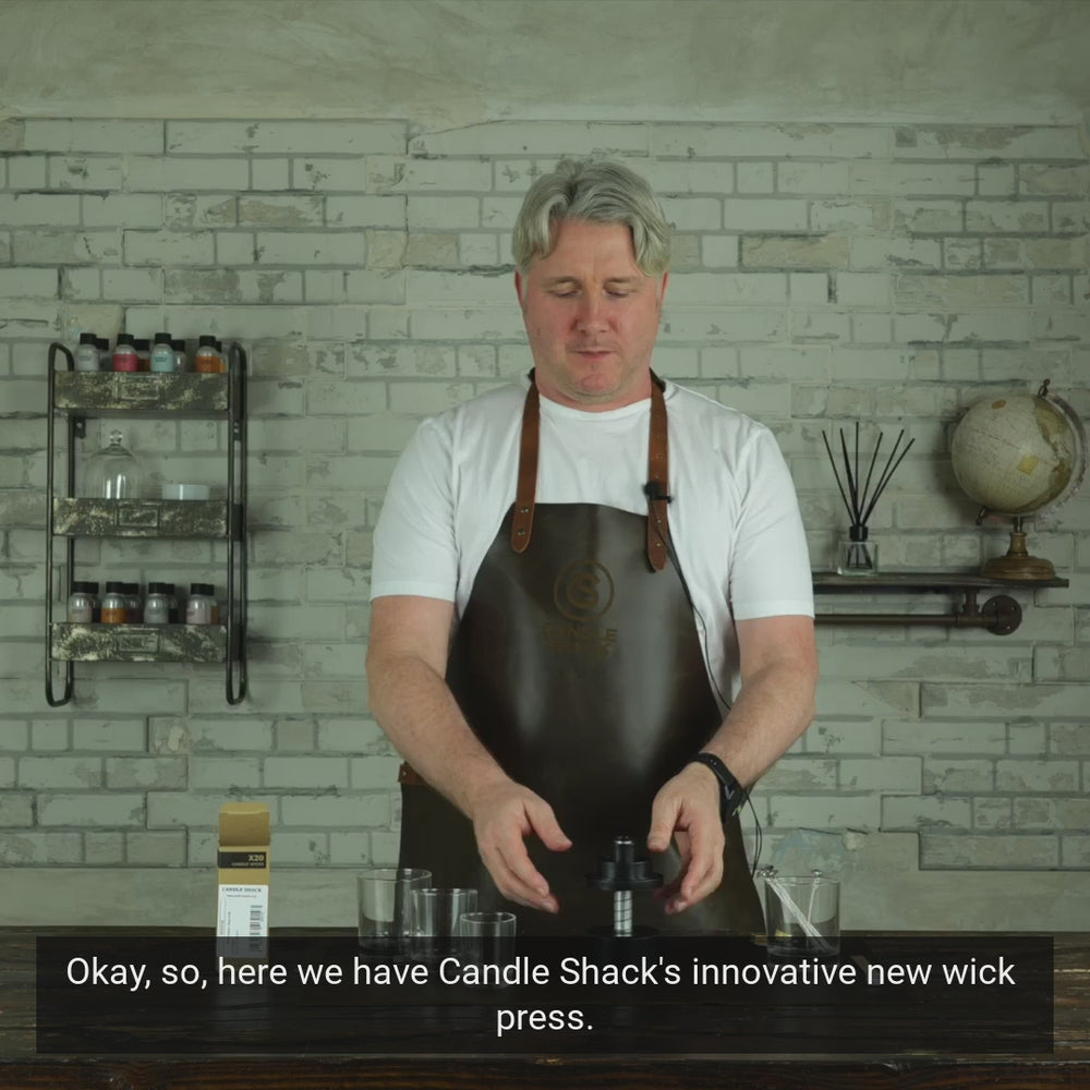 It can be used with cotton or wooden wicks, adhesive pads or glue. For best results, pair it with our Three Jar Wick Centering Tool to keep wicks perfectly in place (works with all jars listed above). The Wick Press can be used on its own or lined up in rows for faster production.